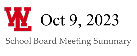 This document is my summary of the public school board meeting, not the official meeting minutes. My personal thoughts and opinions are given in italics and represent my own views which do not necessarily reflect those of any other member of the school board. I identify myself as Mumford in the summary but use first person when describing my personal thoughts and opinions. Previous agendas, minutes, and audio recordings can be found at the WLCSC website.