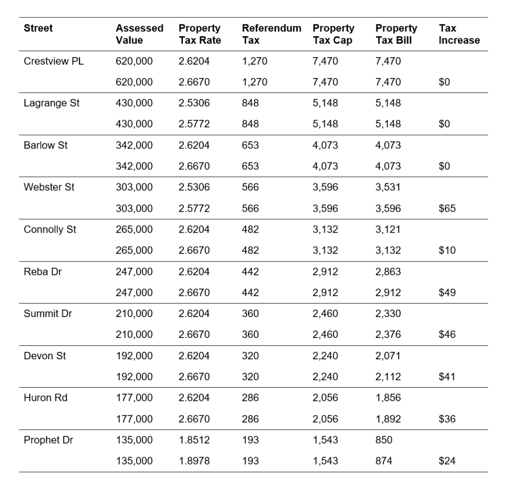 Marley and Witt are incorrect; there are many homes in our district that have an assessed value of less than $270,000. Through the online Tippecanoe County Property Tax Database, you can look up the assessed value for any property in the county (search by owner name or by address). See the table below for some example homes located on various streets in our school district. In the table, property taxes are calculated two ways: the top row for each house reports the actual property tax this year while the bottom row reports the property tax the homeowner would have paid this year if the school debt service tax rate was increased by 0.0466.